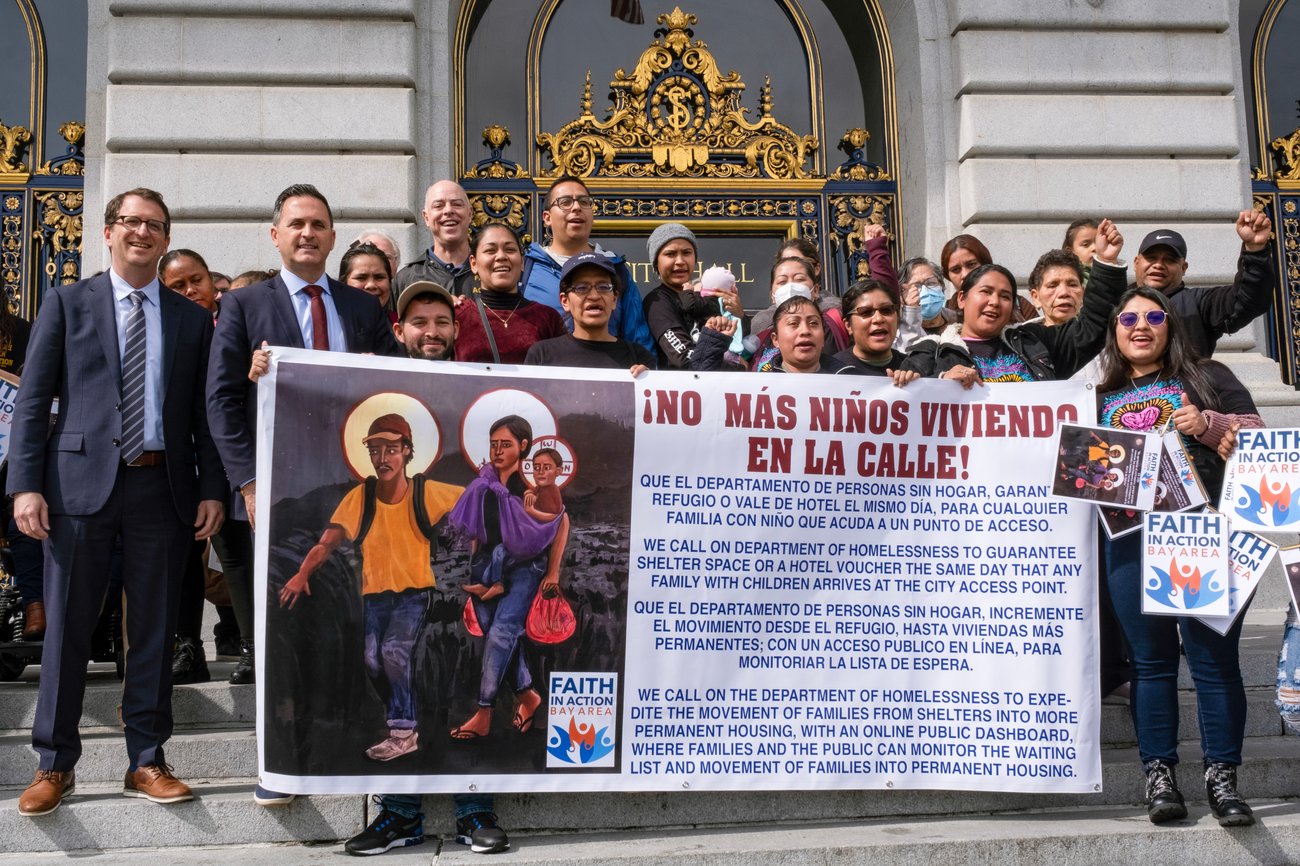 At a rally outside San Francisco City Hall, Supervisors Dean Preston and Ahsha Safaí advocate for prioritizing shelter or hotel vouchers for unhoused immigrant families with children. They support a resolution to develop a comprehensive plan focused on families experiencing homelessness and to create a multilingual public dashboard for tracking waitlists and families' progress toward permanent housing. |