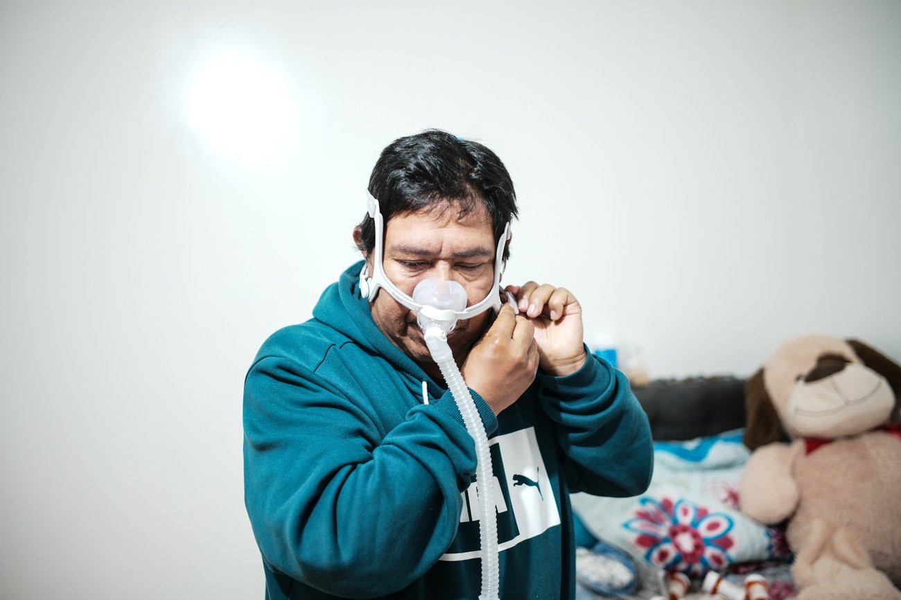 Osbaldo Varilla-Aguilar, 46, puts on the oxygen ventilator he uses every night, at his home in San Francisco, on Feb. 26. “There are times where I can’t breathe, it’s difficult,” Varilla-Aguilar said, who was in a COVID-induced coma for more than three months. He still hasn’t recovered his strength, and experiences long-COVID symptoms. |