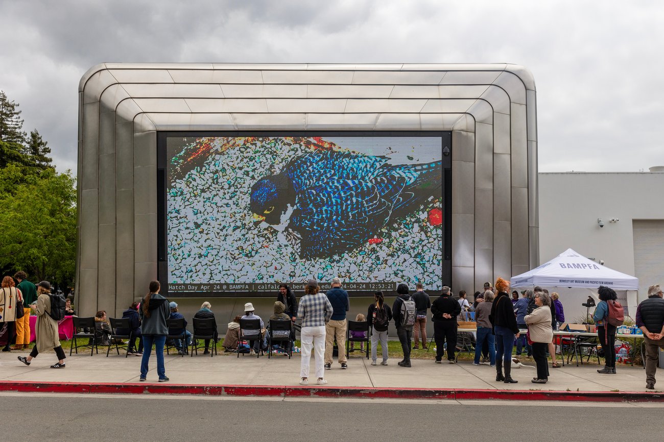 People gather outside the Berkeley Art Museum and Pacific Film Archive to watch the last of peregrine falcons Annie and Archie’s four eggs hatch. The last chick arrived on April 25 during Hatch Day, an annual celebration organized by Cal Falcons and BAMPFA. |
