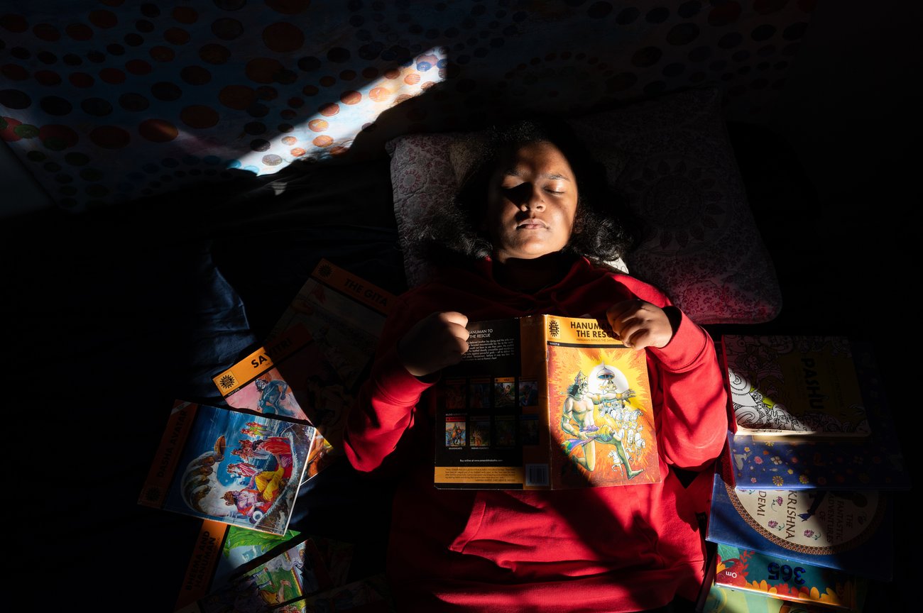 Tiya Mohanty, 13, is surrounded by books at home in Sunnyvale. She connects with her heritage through stories from the classic Indian publication Amar Chitra Katha, plus modern works from the library. This image is part of the “We Belong” series exploring Bay Area South Asian identity which is currently on display in San Jose’s libraries. |