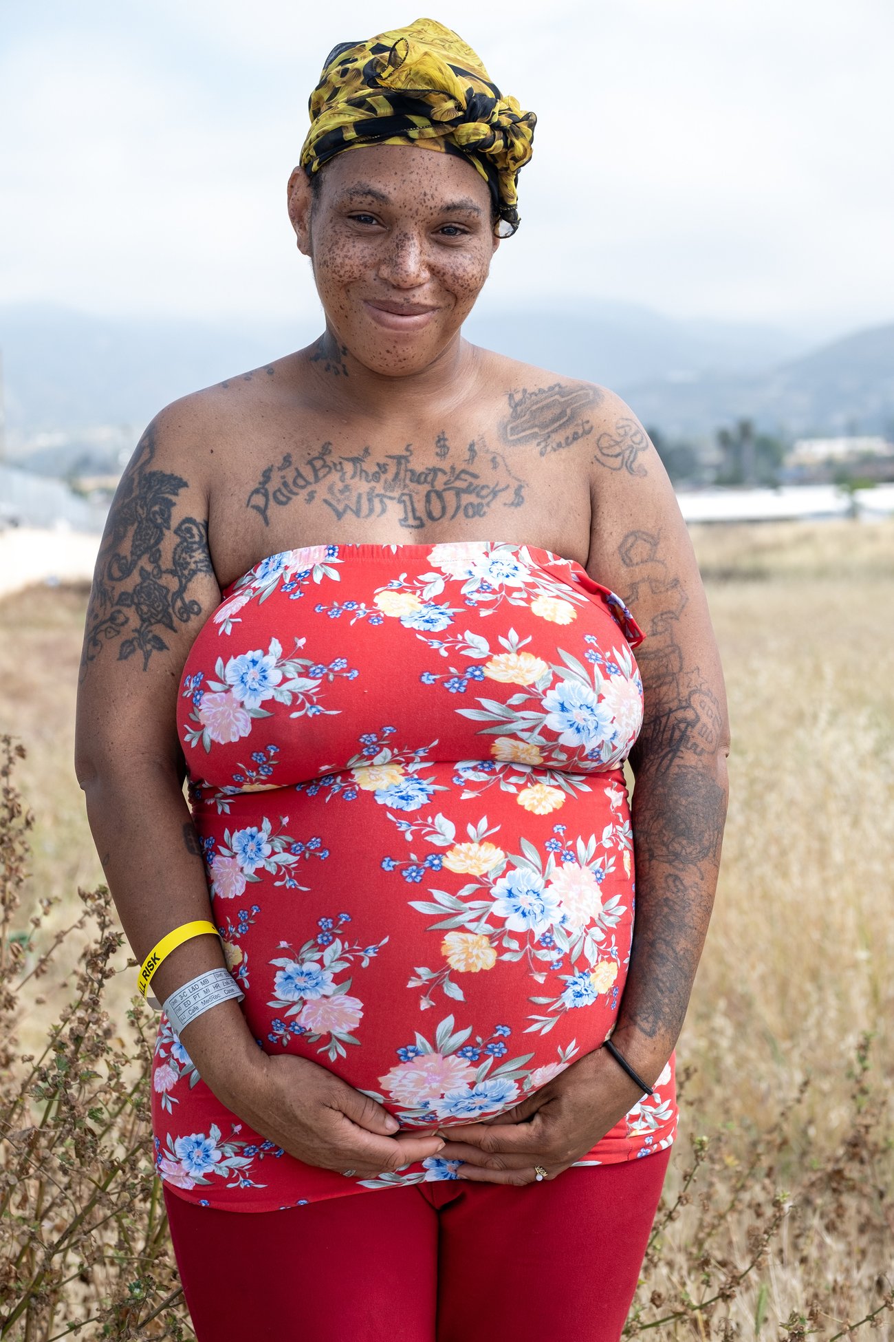 Dominique (no last name given) is seen near the encampment where she lives in San Bernardino on May 1, 2024. Seven months pregnant, she receives treatment from the Healthcare in Action street medicine team, which provides onsite lab work and tests to unhoused communities. |