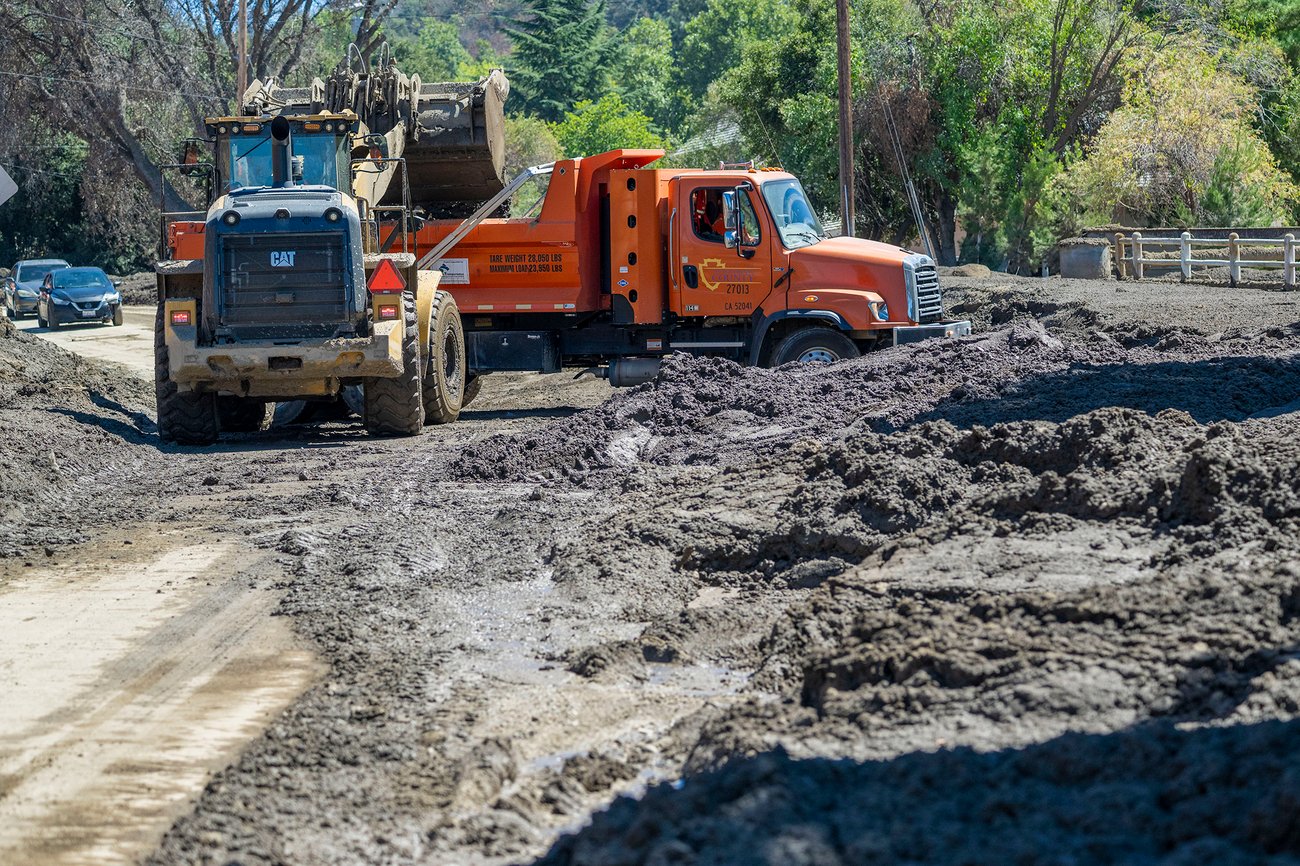 County of San Bernardino workers remove mud and debris from Oak Glen Road west of Potato Canyon Road in Oak Glen on Sept. 20, 2025. Photo by Terry Pierson/MediaNews Group/The Press-Enterprise via Getty Images  |