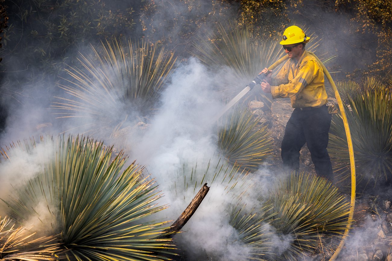firefighter steps between the needle-sharp points of chaparral yuccas while hosing down flames on the day after the Bridge Fire at Mount Baldy in San Bernardino County on Sept. 11, 2024. Photo by David McNew, Getty Images |