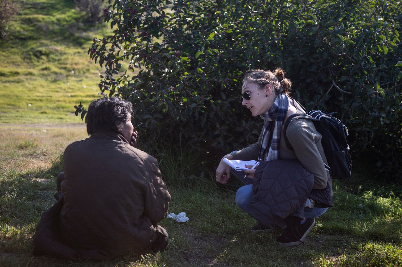 CalMatters reporter Marisa Kendall has a conversation with an unhoused person on the side of a highway in Fresno on Jan. 30, 2025. Photo by Larry Valenzuela, CalMatters/CatchLight Local |