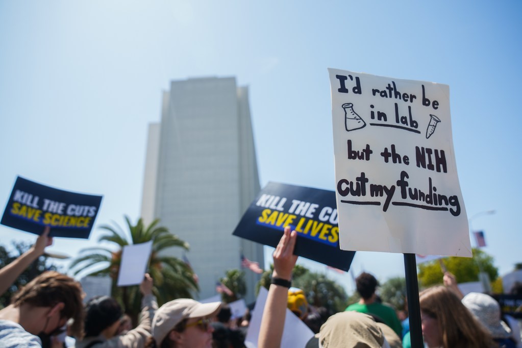 Participants, rallying against the Trump administration's cuts to research funding, gather outside the Wilshire Federal Building in Los Angeles on April 8, 2025. Photo by Jules Hotz for CalMatters