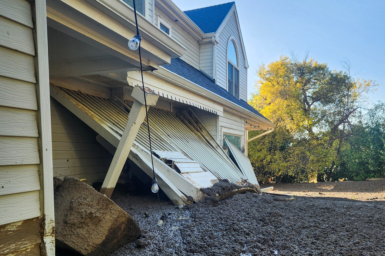 Novacoski-Bennett and her husband Gary live on Potato Canyon Road, directly downstream and adjacent to the Oak Glen Steak House in the small community east of Yucaipa. When a ten-foot wall of mud pushed against their house, they lost their AC unit, their fuel source, 60 apple trees, their rental campsite and their wrap-around porch. Their back door opens onto a ten-foot drop, with a plywood serving as a barrier. They lost $10k in annual revenue between the campsite and the trees, and spent $144,000 of their savings just to remove the mud from the property. They have a makeshift fuel system set up by a church member, but used the fireplace and space heaters to warm themselves before it was installed.