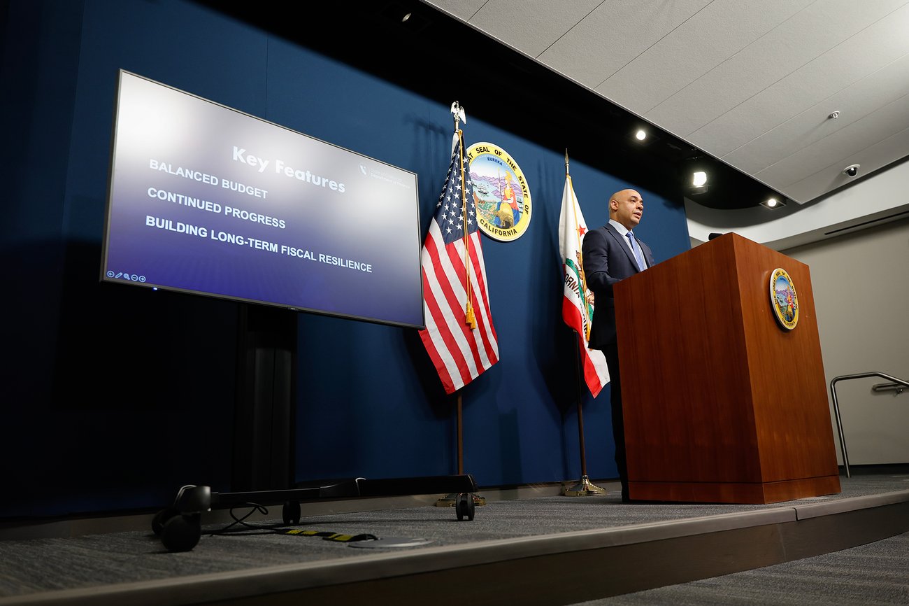 California's Director of Finance, Joe Stephenshaw, leads the budget proposal presentation for the 2026-27 fiscal year, at the Capitol Annex Swing Space in Sacramento, on Jan. 9, 2026. Photo by Fred Greaves for CalMatters |