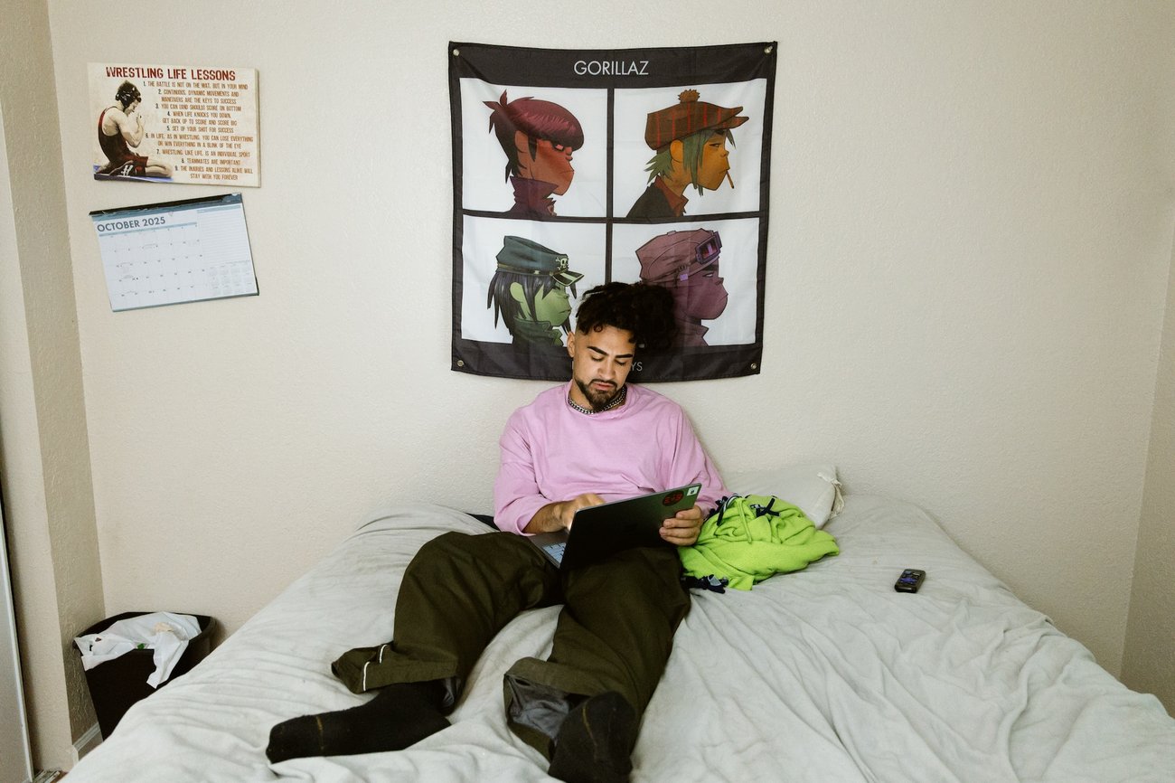 Jodeah Wilson sits on his bed while using his laptop in his off-campus apartment on Oct. 17, 2025. He is now looking for work to cover rent and other living expenses while continuing to pursue his education goals.