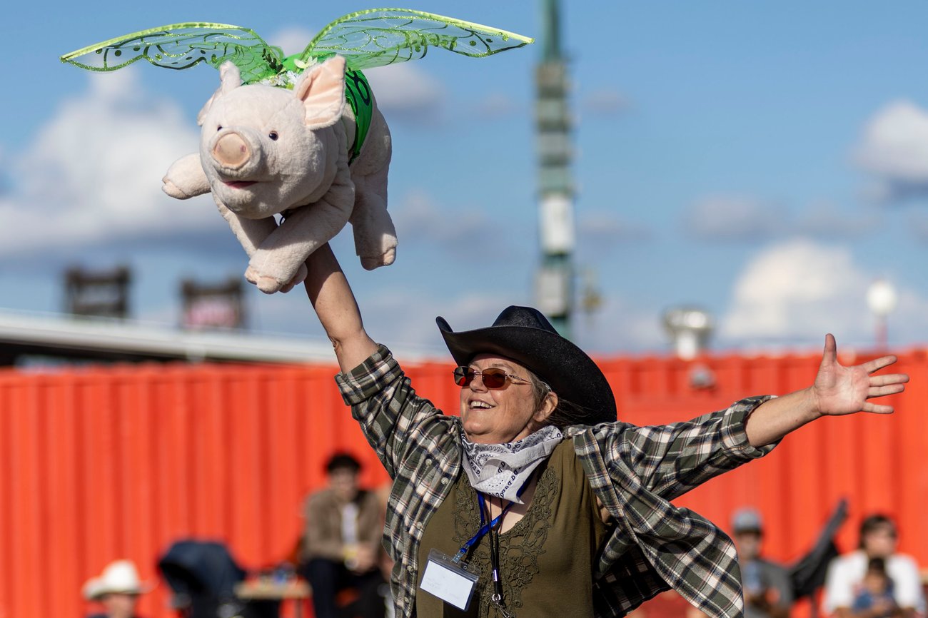 Danette P. Holds a stuffed pig dressed liked Tinker Bell at the start of the pig races at Dell'Osso Family Farm in Lathrop on Friday, Oct. 3, 2025.
