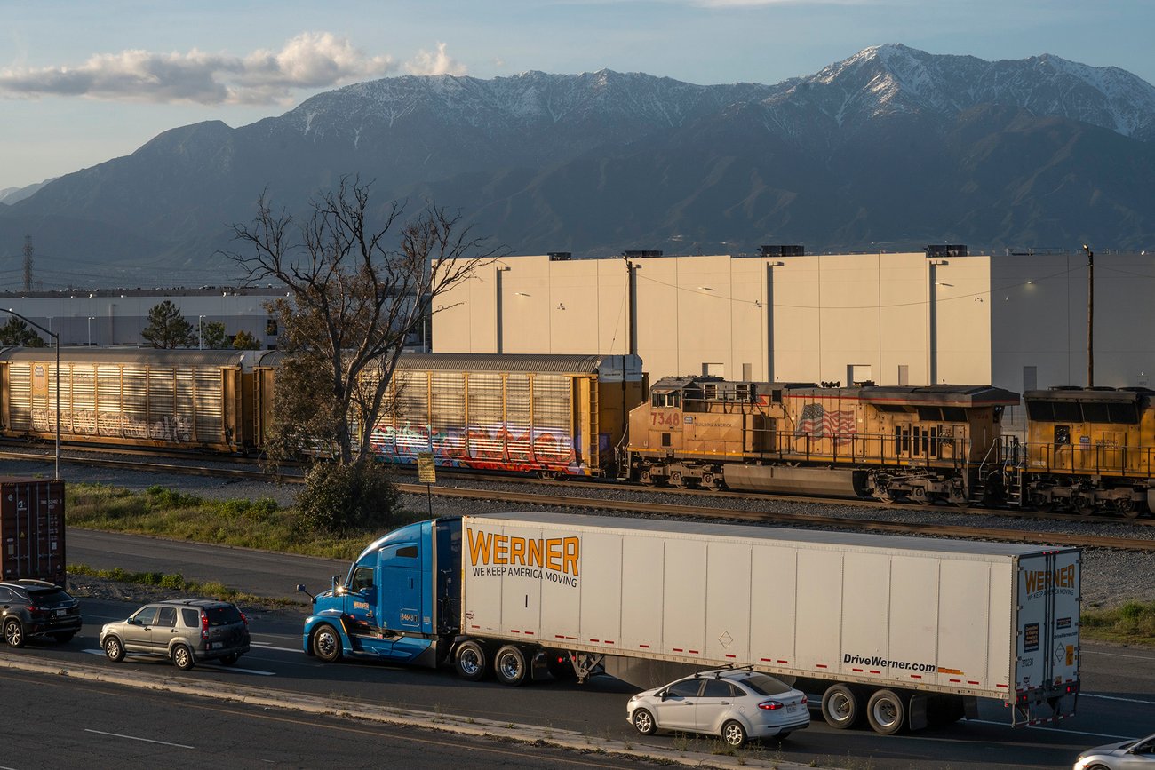 Werner truck drives past an Amazon sort center in Mira Loma, April 4, 2023. Photo by Aryana Noroozi for Black Voice News / CatchLight Local |
