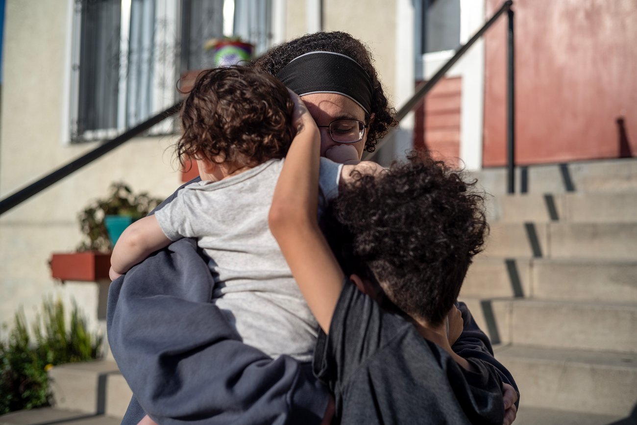 Loreal Duran with her children, ages one and seven, in front of her apartment complex in Los Angeles on Feb. 8, 2025. Loreal’s husband Giovanni Duran, born in El Salvador, was detained by U.S. Immigration and Customs Enforcement agents as part of nationwide agency operations in late January and is currently being held at the Adelanto ICE Processing Center.