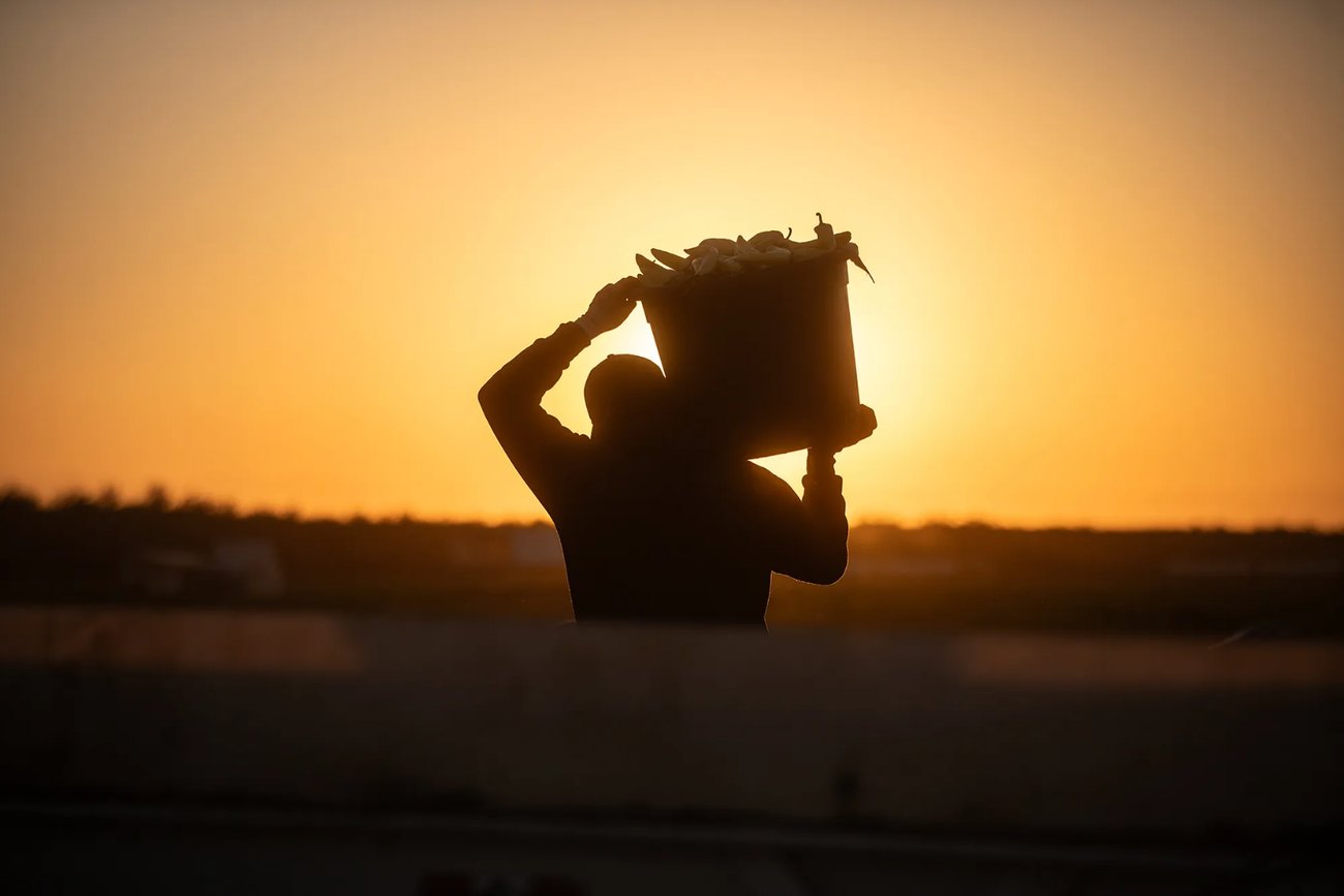 A farmworker harvests banana peppers at a farm near the town of Helm in July. |