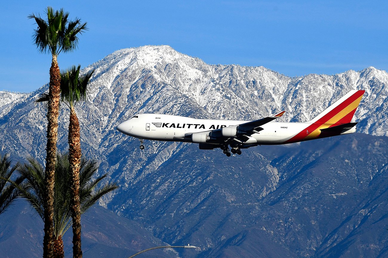 A snow-covered Cucamonga Peak sits high above the Inland Empire as a Kalitta Air cargo jet 747 from Honolulu makes its final approach into Ontario International Airport on Dec. 15, 2021. Photo by Will Lester, Inland Valley Daily Bulletin via Getty Images |