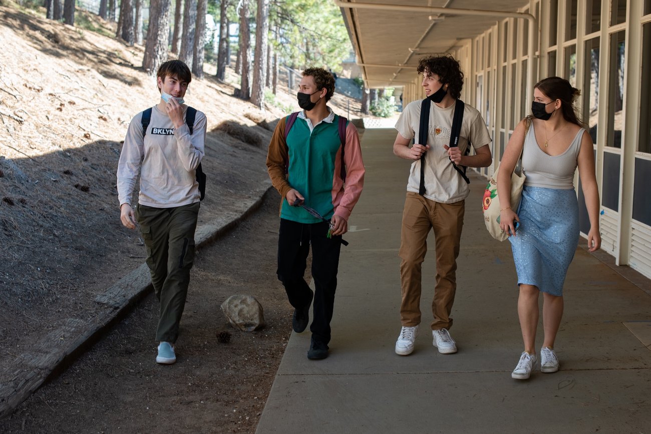 Anthony Pritchett (second from left), a senior at Nevada Union High School in Grass Valley and friends walk between classes. This photograph is from a series that ran in the summer of 2022 by CalMatters and CatchLight reflecting on student experiences returning to school during COVID.