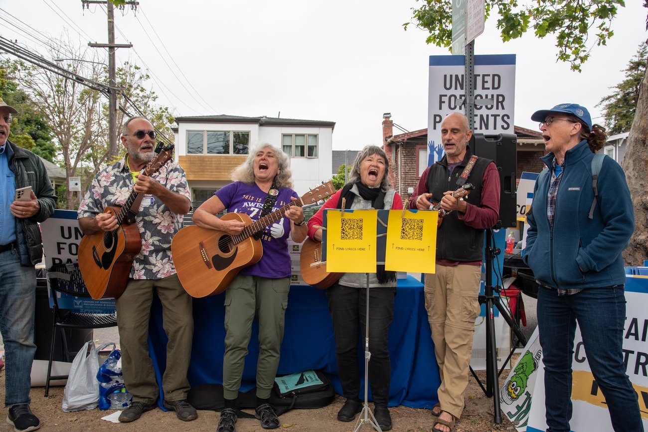 Musicians play protest songs to rally the crowd of workers at the Berkeley strike event on Tuesday. Medical and mental health workers at LifeLong Medical Care gather outside West Berkeley's Health Center during a daylong strike.