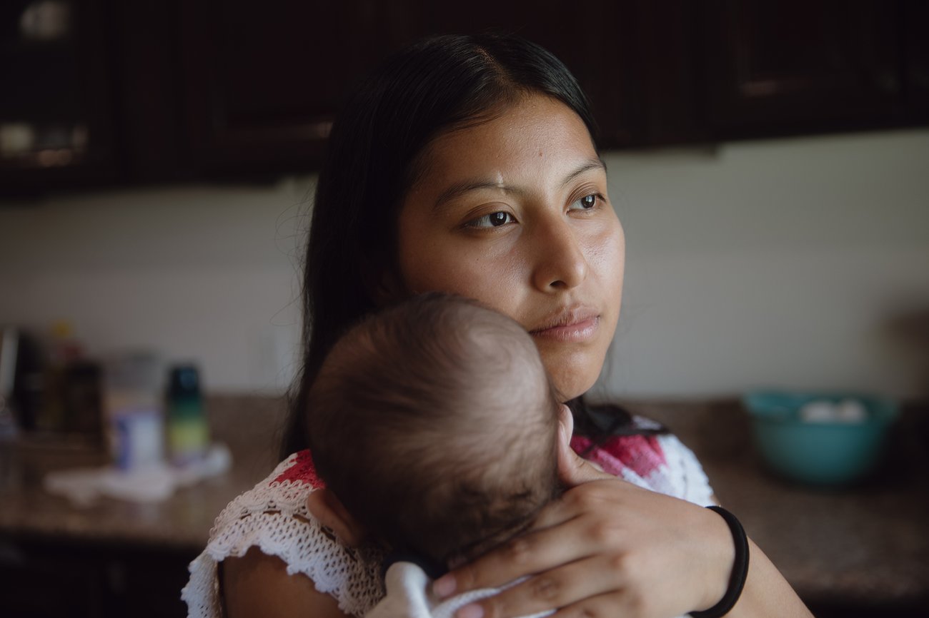 Yurien Contreras holds her newborn inside their home in Los Angeles on July 25, 2025. Her family has barely left home since her father was detained by ICE agents at his workplace.