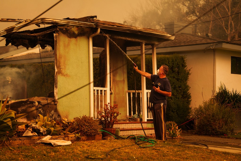 A person sprays water on the flames of a house to prevent the Eaton Fire from spreading in Pasadena on Jan. 8, 2025. Photo by Jules Hotz for CalMatters