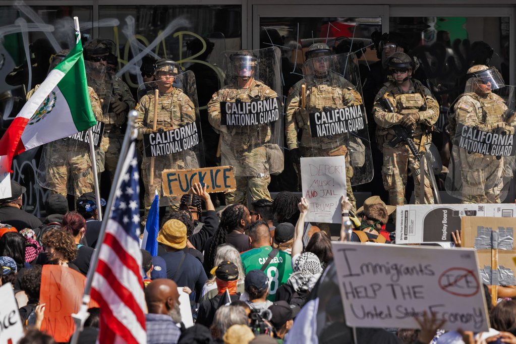 Demonstrators protest against immigration raids as National Guard officers stand guard in front of a federal building in Los Angeles on June 9, 2025. Photo by Ted Soqui for CalMatters