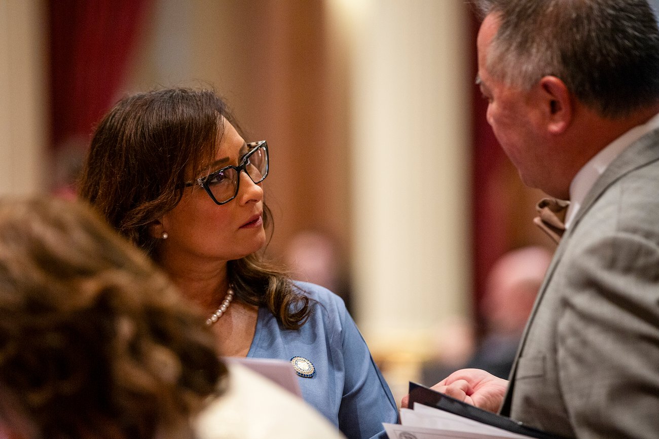 speaks with Assemblymember Philip Ting at the state Capitol in Sacramento on Aug. 29, 2024. Photo by Florence Middleton, CalMatters